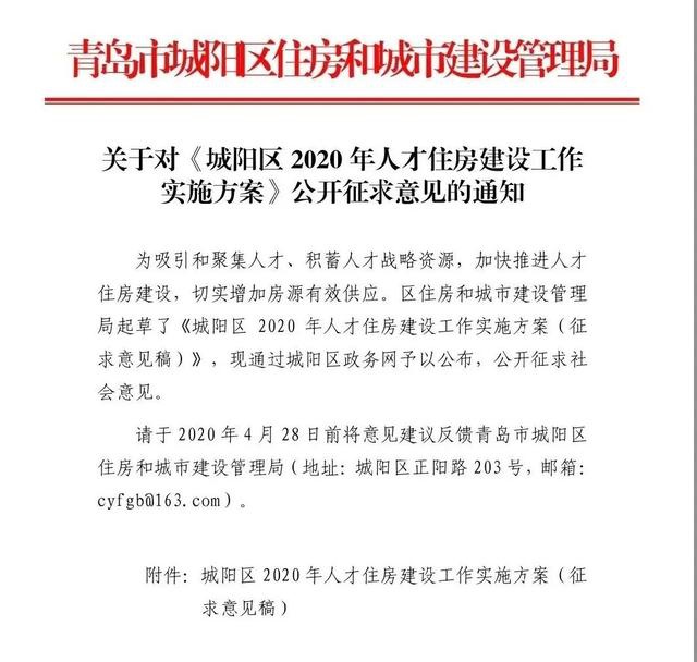 在尝到了共有产权住房的“甜头”后,4月21日,城阳区趁热打铁发布了《城阳区2020 年人才住房建设工作实施方案(征求意见稿)》,公开征求社会意见。