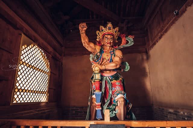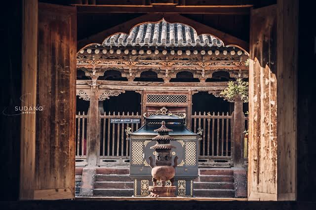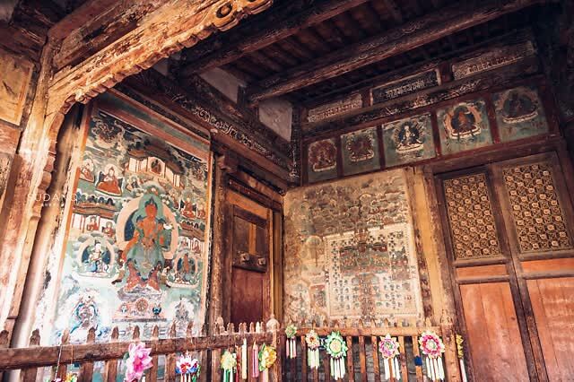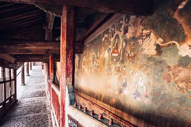 在日落余晖下,丝丝光芒穿过木格窗,若隐若现的古老壁画令人安宁。尤其在这几乎没有游客的平和环境里,我犹如是人世间的一颗凡尘,滚落在光束中,静静地凝视着它。它安静、古朴,没有尘世喧嚣。它精美、雅致,于长河中沉淀了600余年。