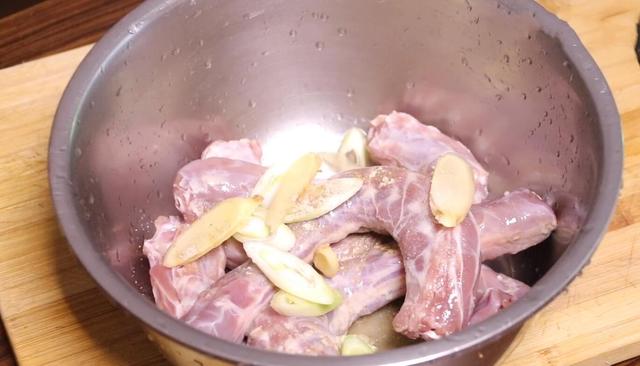 1、配料清洗赶紧,生姜切片,大葱切段备用;准备几根鸭脖先清洗干净,放入清水浸泡一会,有效泡去鸭脖中的血水,再次洗净后沥干水分装入碗中,加入切好的一部分葱段、姜片,以及适量食盐,一勺白胡椒粉、适量料酒,用手抓拌均匀,腌制30分钟;
