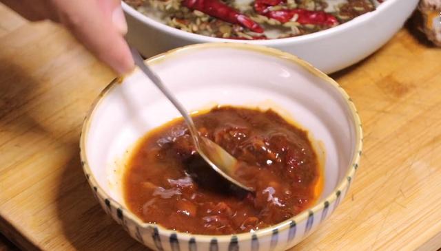 3、准备一些卤料:干辣椒、麻椒、花椒、小茴香、八角、香叶、白芷、草寇,将准备好的卤料放入温水中浸泡10分钟,激发出卤料的香味,10分钟后捞出卤料沥干水分备用;准备一个干净的碗,加入一大勺鲜辣酱、一大勺黄豆酱、两大勺黄其酱,然后倒入少量料酒,用勺子搅拌均匀将三种料酒搅拌化开,酱汁就做好了,放置一旁备用;