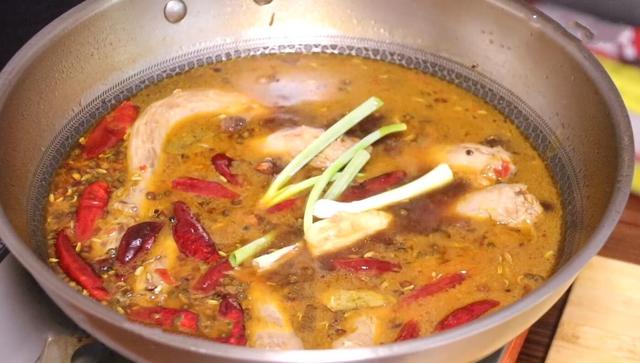 7、40分钟后,打开锅盖,鸭脖已经卤制好了,此时不要急着将鸭脖盛出,还是让鸭脖在卤汤中浸泡放凉;