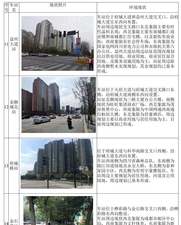 11、益州大道站:车站位于府城大道和益州大道交叉口,沿府城大道呈东西向布置。车站周边现状交叉路口东北象限主要有时代晶科名苑;西北象限主要有南城都汇商业楼和南城都汇住宅楼,以及新街里商业街;西南象限有社会停车场;东南象限为国家电网四川省电力公司和市级机关第六办公区。益州大道站周边站址范围内规划以以供电用地、商业用地、商业居住混合用地、及服务设施用地为主;站址周边除西南侧暂未实现规划,其余规划均已基本形成。
