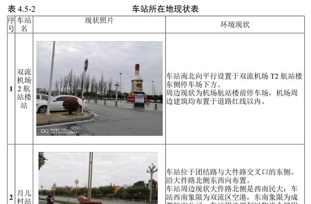 2、月儿村站:车站位于团结路与大件路交叉口的东侧。沿大件路北侧东西向布置。车站周边现状大件路北侧是西南民大;车站西南象限为双流区空港,东南象限为成都航空公司。车站周边规划以物流仓储用地、高等教育用地、防护绿地为主,周边规划已经形成。