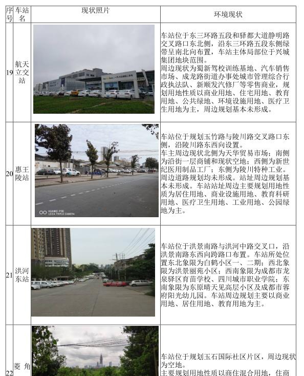 19、航天立交站:车站位于东三环路五段和驿都大道静明路交叉路口东北侧,沿东三环路五段东侧绿带呈南北向布置,车站主体局部位于兴城集团地块范围。周边现状为蜀新驾校训练基地、汽车销售市场、成龙路街道办事处城市管理综合行政执法队、新顺发汽修厂等零售商业,规划用地性质以商业用地、住宅用地、教育用地、公共绿地、环境设施用地、医疗卫生用地为主,周边规划基本未形成。
