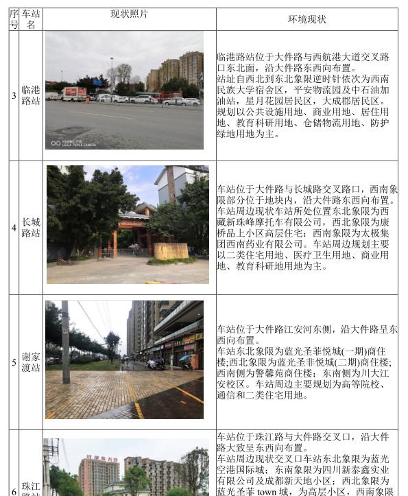 6、珠江路站:车站位于珠江路与大件路交叉口,沿大件路大致呈东西向布置。车站周边现状交叉口车站东北象限为蓝光空港国际城;东南象限为四川新泰鑫实业有限公司及成都新天地小区;西北象限为蓝光圣菲 town 城,为高层小区,西南象限为规划的住宅用地,现状为空地。车站站址范围内规划以二类住宅用地、商业用地、防护绿地、商住混合用地为主,西南象限尚未实现规划,其余周边均已基本实现规划。