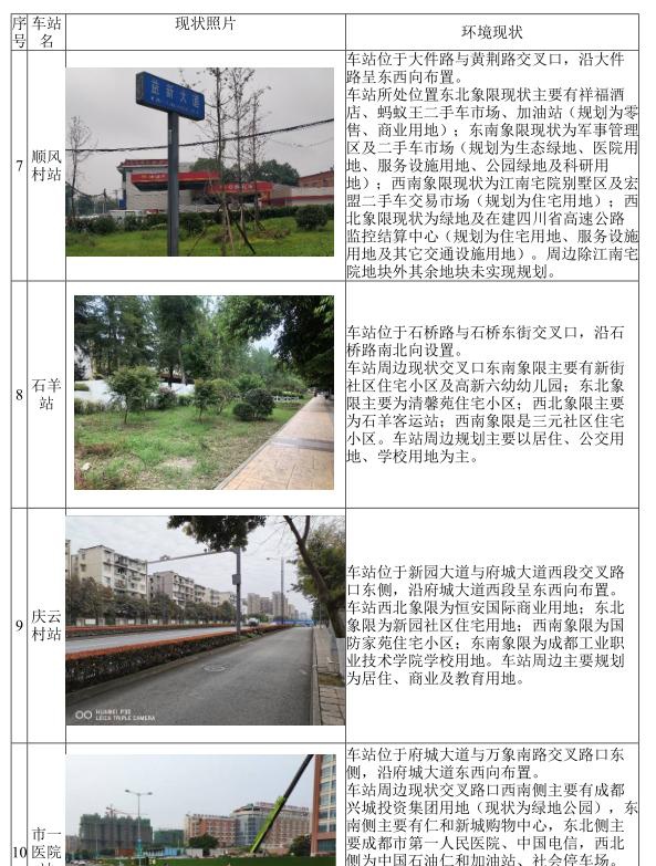 7、顺风村站:车站位于大件路与黄荆路交叉口,沿大件路呈东西向布置。车站所处位置东北象限现状主要有祥福酒店、蚂蚁王二手车市场、加油站(规划为零售、商业用地);东南象限现状为军事管理区及二手车市场(规划为生态绿地、医院用地、服务设施用地、公园绿地及科研用地);西南象限现状为江南宅院别墅区及宏盟二手车交易市场(规划为住宅用地);西北象限现状为绿地及在建四川省高速公路监控结算中心(规划为住宅用地、服务设施用地及其它交通设施用地)。周边除江南宅院地块外其余地块未实现规划。