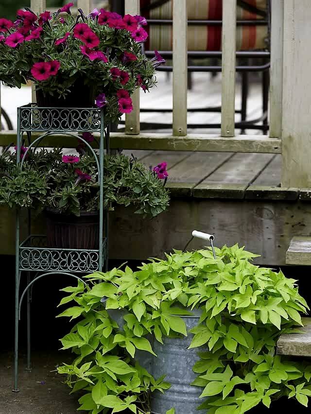 观赏甘薯很适合作为垂盆植物或吊盆植物,它比较适合生长在热带亚热带地区,它的生长速度非常快,要注意偶尔修剪控制形态。