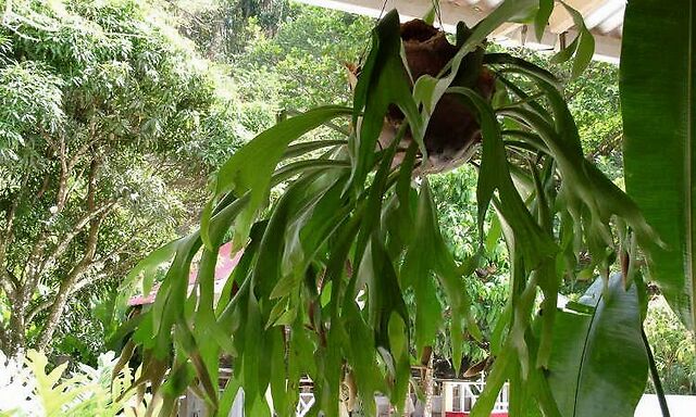 如果水池的旁边没有太多的光照,那可以养一些鹿角蕨,它们原本是生长在树木上的,可以直接将它们悬挂在树木的枝条上,树木的叶子给它们遮挡阳光,在水池旁边有较高的空气湿度,鹿角蕨会长得特别好。