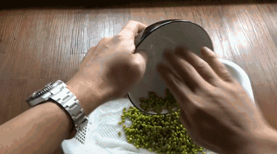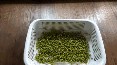 方 法 :先把绿豆(黄豆、豌豆均可)浸泡在水中5个小时,等到种子吸饱水膨胀,会开始冒出小芽。