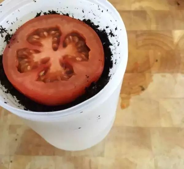 准备一只装了土的小花盆或小杯子,把土浇湿浇透,然后拿起切好的番茄片放在上面。