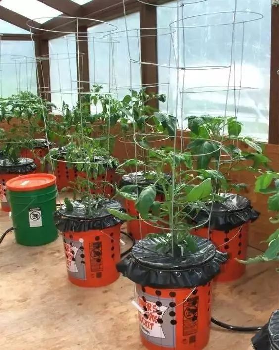 除了传统的竹子绑枝扶植法,还可以用铁丝做一个这样的圆网让番茄攀枝。