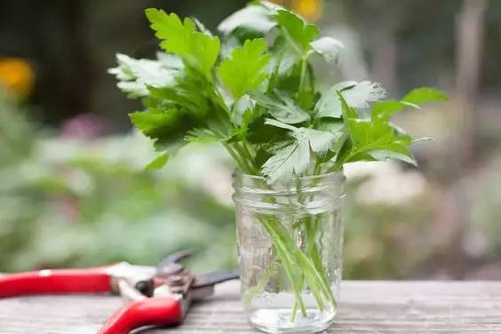 裁剪若干较嫩的香菜茎叶放在玻璃瓶中,瓶里盛放2/3的水。