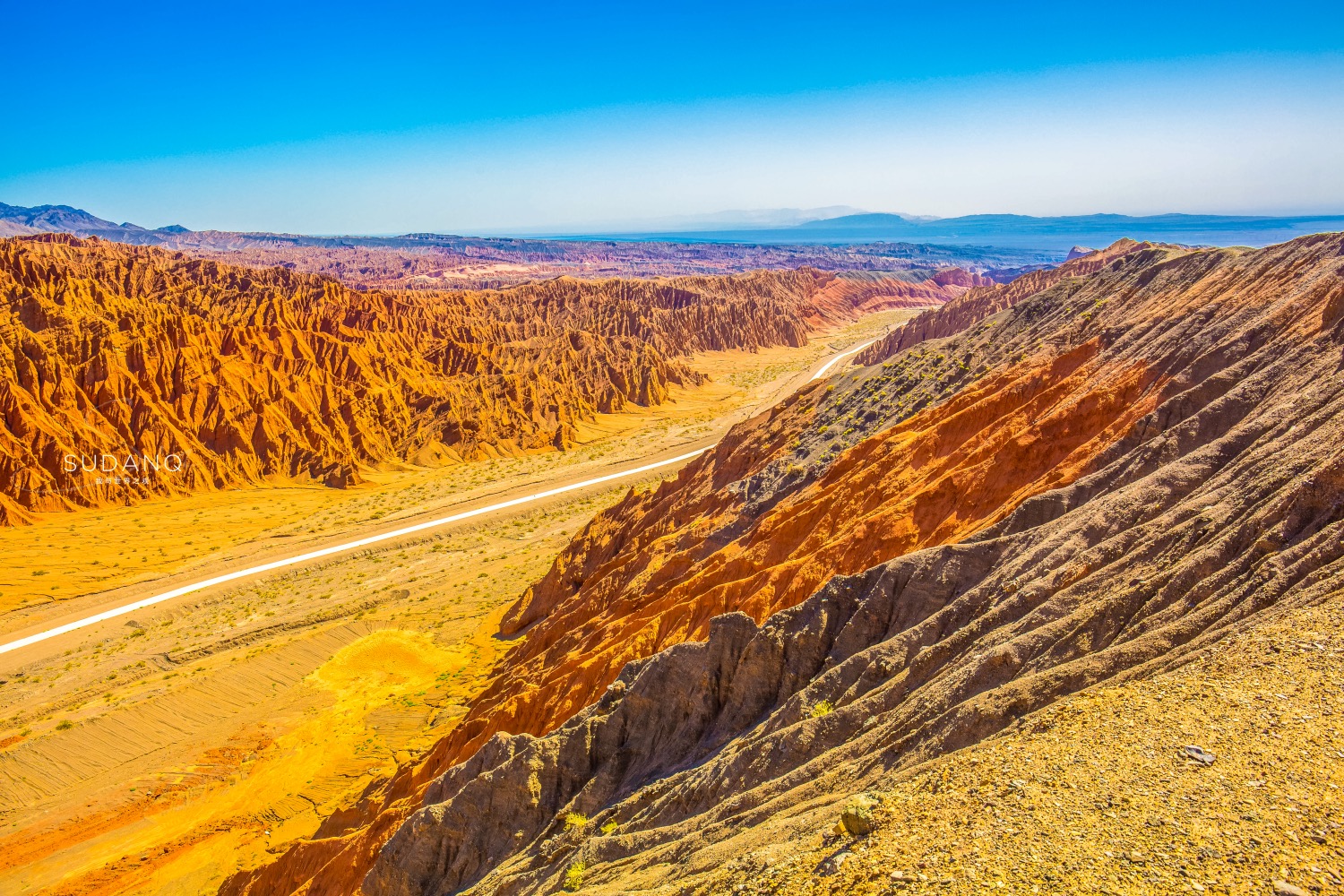 这是一个炎热的丹霞世界,站在这里,一种“君临天下”之气势油然而生。想不到铁山公主的宝贝儿子红孩儿竟还有如此地盘,这些奇怪色彩的山石由中生代的侏罗纪、白垩纪和第三纪的赤红色砂、砾岩和泥岩组成,如今的风貌形成历史大概是5000万至6000万年前。