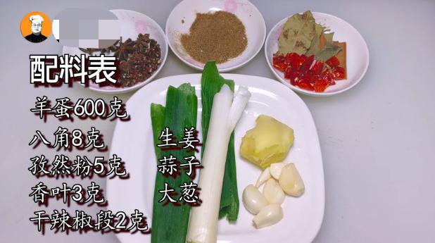 羊蛋600克,八角8克,孜然粉5克,香叶3克,干辣椒段2克,生姜、蒜子、大葱适量。