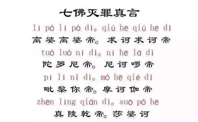 此咒出自《大方等陀罗尼经》,世尊因文殊师利法王子的请求,而说过去七佛曾诵过的咒。一个人若造了四重五逆罪,不仅后世受极大苦报,现世也不得平安,为了消灭罪障,最宜持诵七佛灭罪真言。