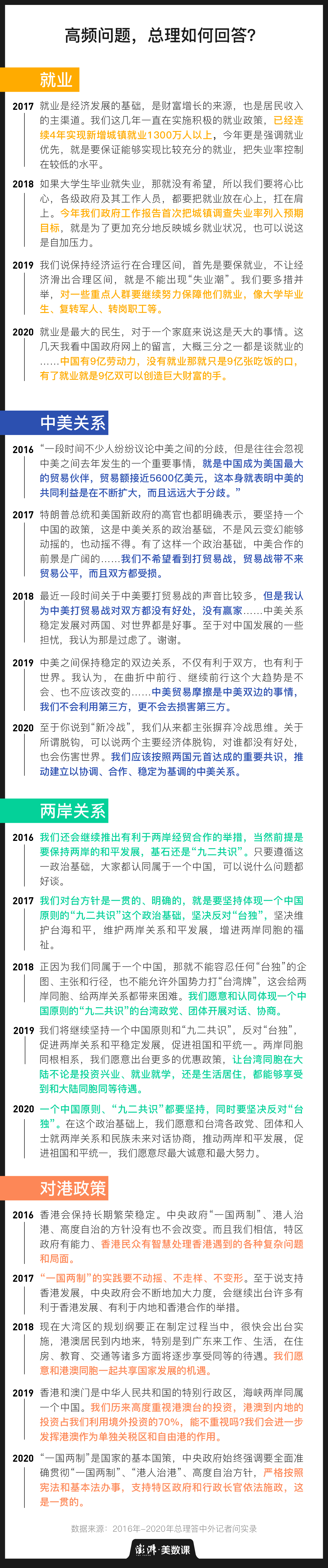 每年记者们的问题中都会涉及中美关系、两岸关系、对港政策等话题。