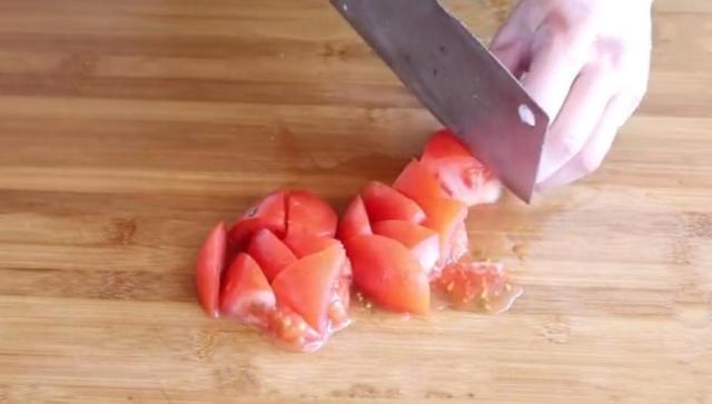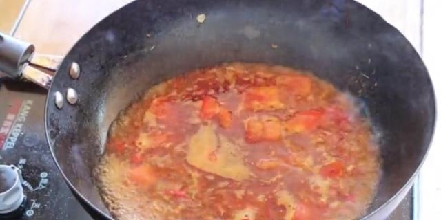 3、锅中留适量底油,油热下入一勺郫县豆瓣酱,开中小火翻炒出红油,然后下入切好的姜末、蒜末和小米椒,继续不断翻炒炒出香味,紧接着下入切好的西红柿,不断翻炒将西红柿炒出汁水;