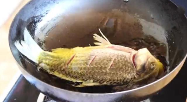 2、起锅,锅中倒入足量的食用油,油温5成热的时候开中小火,将处理好的鲤鱼轻轻从锅的边缘划入慢慢煎,轻轻晃动锅避免粘锅,刚下锅的鲤鱼不要着急翻面,这样鱼肉很容易碎掉,将鲤鱼一面煎至金黄后翻另一面继续煎制,鱼尾和鱼头部分不好煎,可以晃动锅中的热油到鱼头鱼尾处,待两面煎至金黄后控油盛出装入盘中备用;