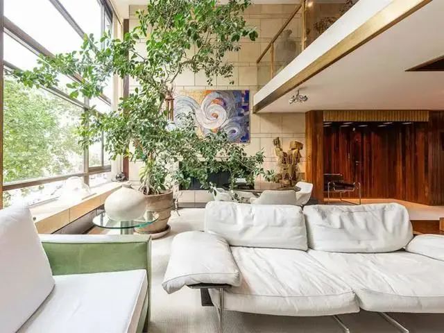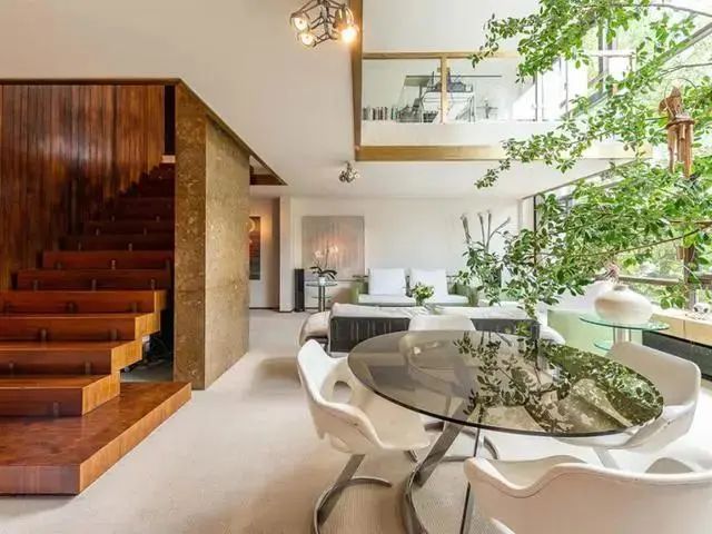 沙发后面是一个小餐桌,油画的的画框作为客厅的一部分背景墙,上面则是镂空的天窗,室外的大量采光落进房间,加上室外绿植的衬托,感觉自身在鸟语花香的大自然里。