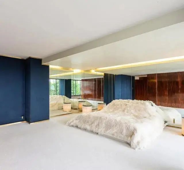卧室主要以舒适为主,床头的背景墙是大面积的镜子,空间感觉被放大。白色吊顶上装上暖色的灯带,带来了照明。另一面则是无把手的入嵌的隐形柜子,满足收纳。用毛绒制的被褥铺在床垫上,这样的床一定很舒服吧!