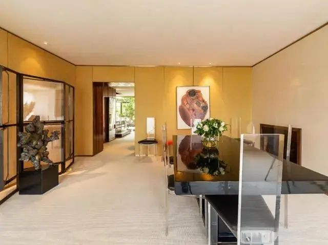 餐厅在一片暖黄色的墙饰背景下,用餐氛围显得比较温暖,黑色的长餐桌表面像镜子,能够放射出房间的墙画和小绿植,另一方面,业主选用的是黑色坐垫,靠背是透明的餐椅,两两搭配起来很有特点。