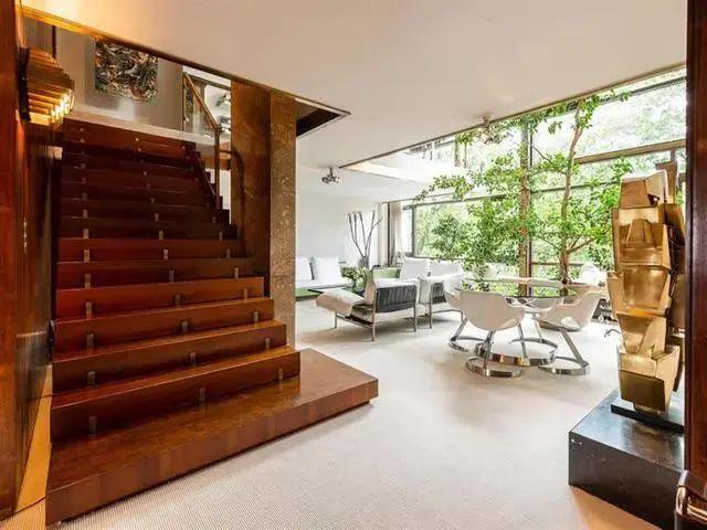 客厅的另一部分便是木制的楼梯通往二楼,侧面用玻璃框架的护栏+石板为隔断,保证业主上下楼梯的安全,楼梯每一阶层都有三个木条用以稳定楼梯,外观上也形成统一感,