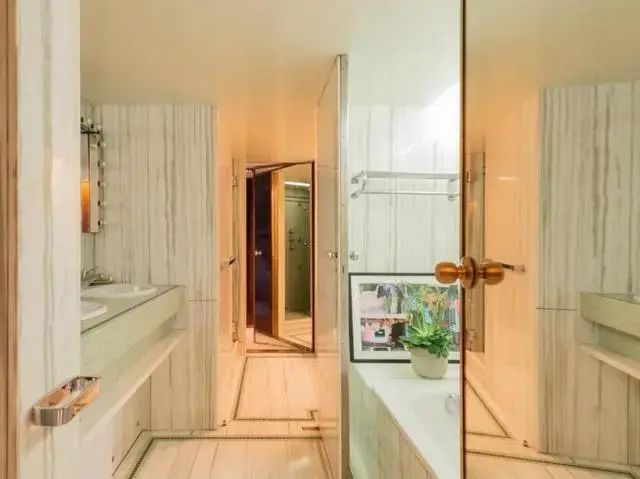 洗手间盥洗区洗手台下除了橱柜可以收纳,还有一层隔板可以放一些洗漱用品,侧面即是用推拉门隔开的沐浴区,用推拉门隔断不仅可以节省隔断墙的空间,外形也很好看。浴缸上安装置物架,可以放换洗的衣物。
