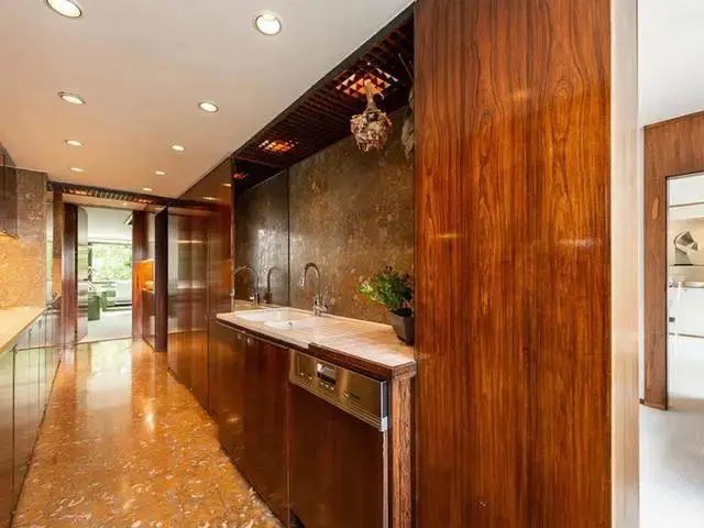 厨房在一楼的走廊里,前后通风的效果佳。入嵌式的木制橱柜,柜门采用的是无把手的隐形柜门,在外边看不出有橱柜,看上去厨房很整齐,无主灯照明设计满足厨房各个死角的照明。
