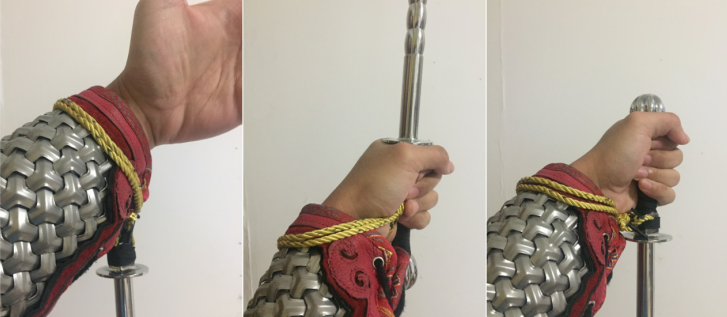最后来讨论下关于手绳的系法。为了做到不影响武器的使用,鞭的悬挂应做到贴近手腕位置,最好可以进行一定的固定以减少其晃动。根据一般的手绳系法来系,我们可以看到鞭柄位置位于手腕外侧,此时将手腕翻腕即可正持抓取钢鞭,使用方便。但是晃动相对较大,在进行拦枪时,由于左手位于前方,手腕外翻时,鞭会相应往内侧甩动,在马上会抽击马的颈部,干扰马匹,甚至对马匹造成伤害,这是不合理的。但是如在介绍马槊技法时我们说过,马槊对决中拦拿是很主要的动作,如果说由于佩戴钢鞭而舍弃这个动作,这无疑是不现实的,也无从说不影响枪的使用,因此笔者认为这种系法值得商榷。