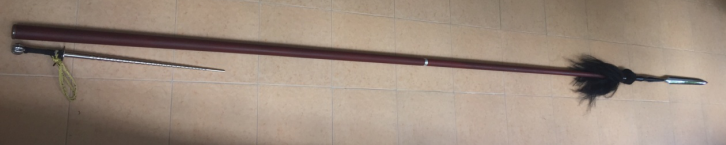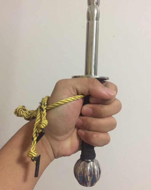 笔者所用锏长80公分,其中,锏身60公分,柄20公分。调节手绳周长为20公分时,手刚刚可以进入绳圈,自然抓握位置在柄头配重锤处,同时,当正常持握时,如此短的手绳会绷紧陷入肉中,使用极不方便,这显然是不合理的。当手绳完全不妨碍使用时其长度大概在40公分周长左右,此时连柄都摸不到,同时,手自然下垂时手绳加上锏在一米左右,拖于地面,很难想象古代大将如同囚犯拖着锁链一般拖着把兵器走路的情景,这一方法亦不可取。工欲善其事必先利其器,在最基础的兵器形制没解决时,关于鞭枪的使用问题便暂时搁置下来。
