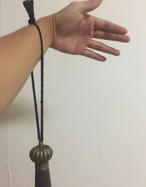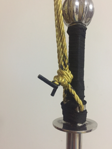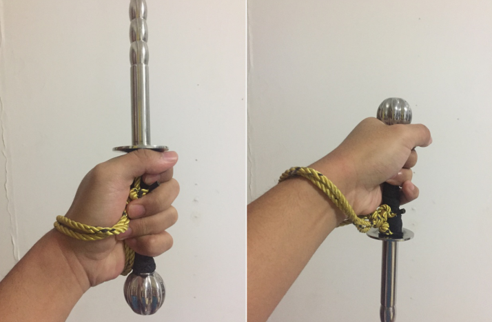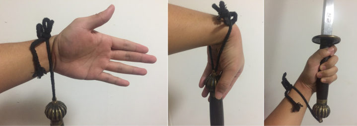 因此笔者在此系法基础上略加改动,将绳结位置系于柄的根部,这样一来,钢鞭悬挂于手腕时,手腕动作对钢鞭晃动的影响得到相应减小,虽仍有一定的晃动,但笔者认为较之第一种方法相对合理。在这种系法上,手柄位置较上种系法相对较高,因此正持、反持都较为方便,持握方式的灵活也是这种系法的一大优势。