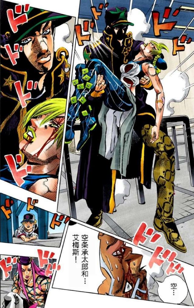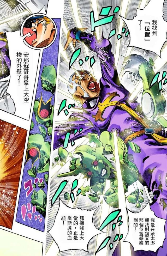 正因如此,不管乔家人如何努力,他们最终都会成为神父觉醒替身天堂制造的跳板,所以我们能看到神父挨了白金之星一拳后不仅没大碍,而且还夹在门框里顺势升天了,之后承太郎对神父投掷钢矛时,神父甚至还凭此找到了和新月来临重力条件一致的位置。