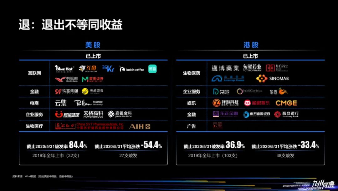 陈颉认为投资机构退出并不等同于收益。在2019年美股上市的30多支中概股里,截至2020年5月31日,破发率达84.4%,上市后平均跌幅超过50%;港股相对表现好一些,2019年100多支中国公司在港股上市,破发率截至5月31日达36.9%左右,平均跌幅达33.4%。