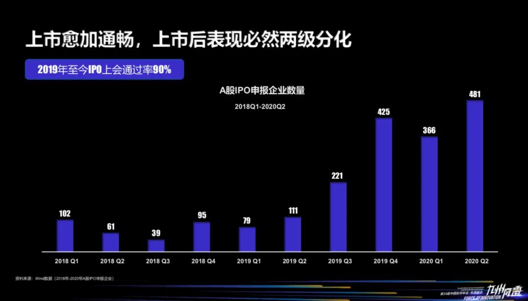 在座有很多人民币基金大佬应该感触非常深,从去年的科创板推出,到今年年底将推出创业板注册制。自这两个巨大的利好消息释放之后,我们会看到过去3-4个季度的IPO申报企业数量急剧上升,过会率达到90%。
