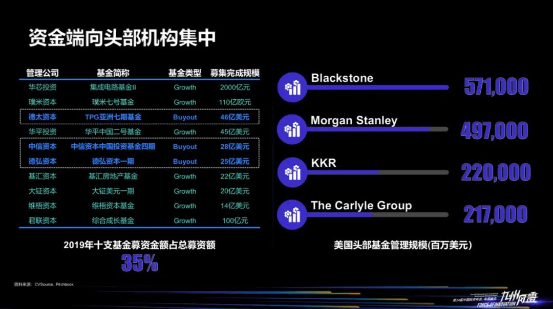 再回到资金端本身,对大部分的机构而言,募资越来越难。但事实上,大量的资金聚拢到头部机构。2019年披露的10支基金总募资额达到整个市场总募资额的35%。