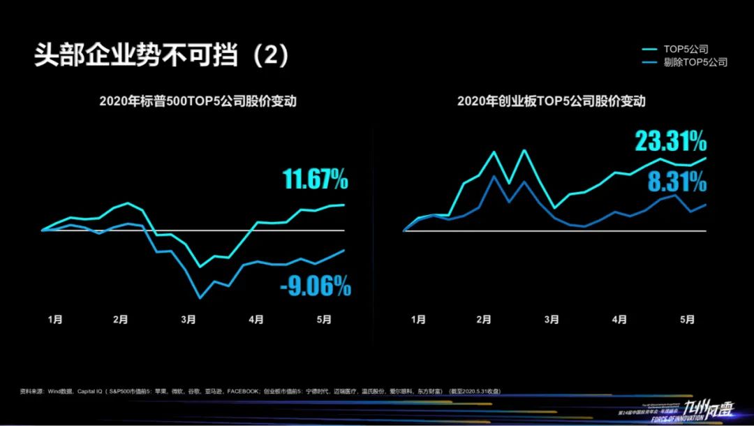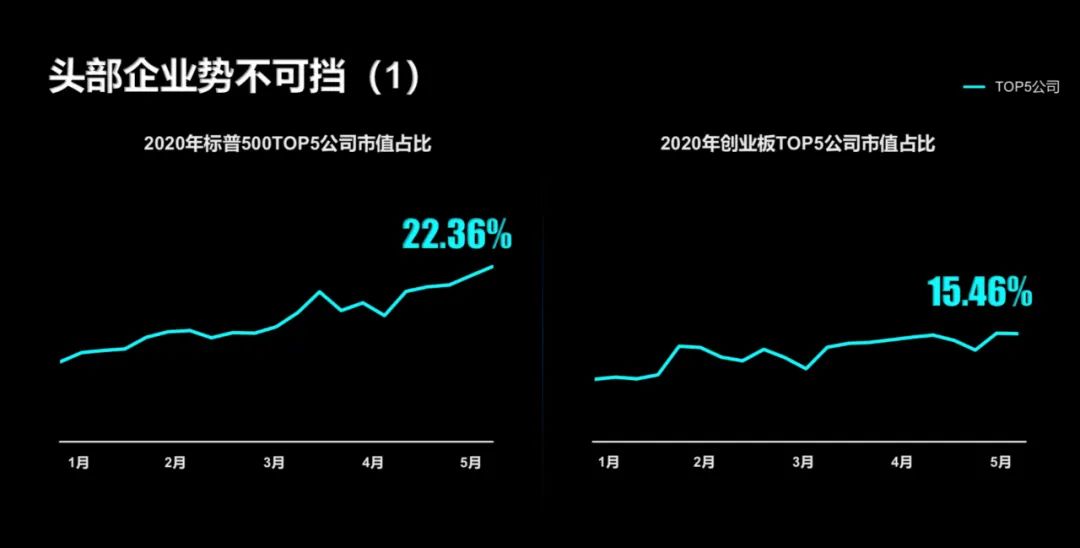 我们看到头部企业不断集中。标普500市值前五的公司,占整个市值比重的22%,而创业板TOP5公司在创业板的市值已达到15%。