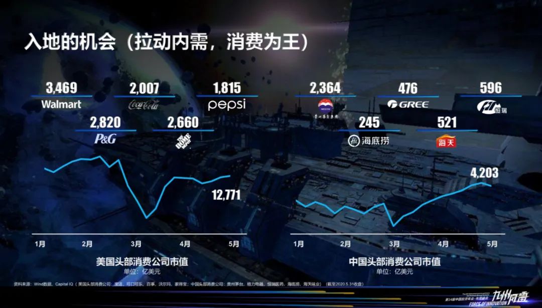 消费,其实是包括了很多,包括医疗,包括衣食住行。我们随便举5个消费的头部公司,大家都知道。我们的国民品牌茅台,到格力、恒瑞、海天,都到了500亿美金左右的市值。中国5家头部消费公司也有4,200亿美金的市值。未来,这个市场还会继续增长,所以入地也是一个巨大的机会。