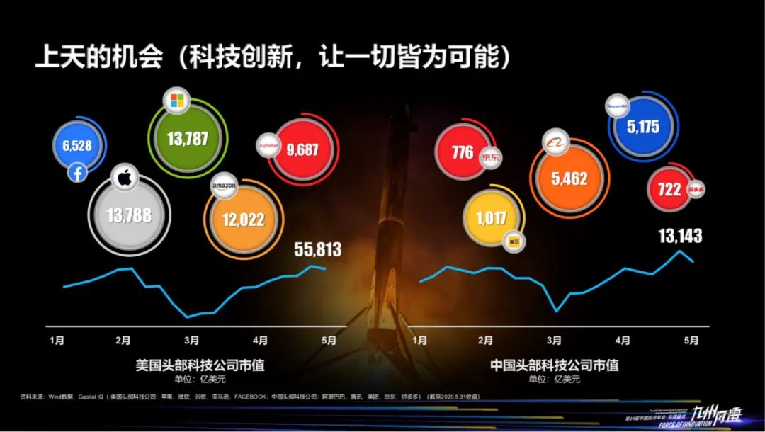 我们看中国头部的5家科技公司,从阿里、腾讯、美团、京东、拼多多,加起来的市值到了1.3万亿美金,平均每家到了2-3千亿美金的规模。
