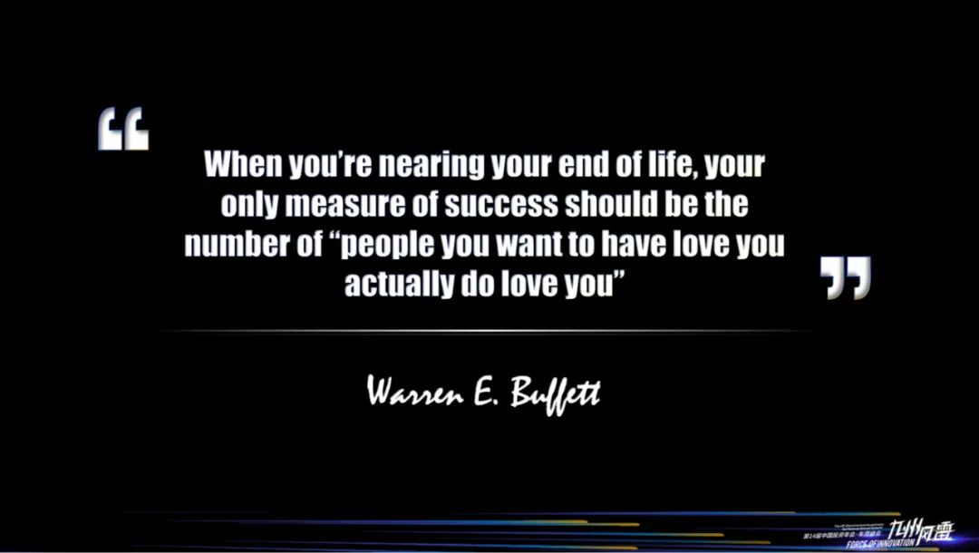 在说完上天入地的机会之后,还是让我们审视一下自己的内心,这句话是Warren Buffett说的,最近我非常尊敬的一位好朋友也和我说了同一句话 ——“When you are nearing your end of life,your only measure of success should be the number of people you want to have loveyou actually do love you.”