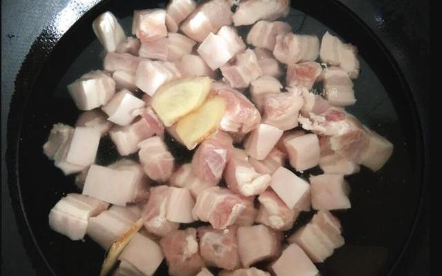 3、再次起锅,倒入适量清水,将切好的五花肉冷水下入锅中,加入适量料酒、姜片,开大火煮开后撇去锅中的浮沫,撇干净后再煮2分钟,2分钟后捞出后清洗干净沥干水分备用。五花肉一定要冷水下锅,这样才能充分煮出五花肉中的血水,有效去除腥味;