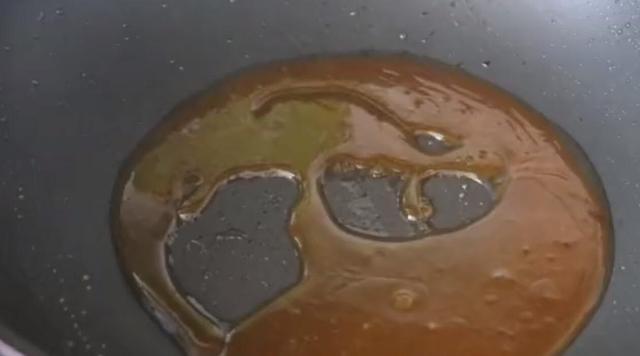 4、起锅,锅中倒入适量食用油,油热下入一小撮冰糖,开小火不断翻炒将冰糖炒化,当炒化的冰糖慢慢变成焦糖色并且冒出大量的小气泡的时候,说明糖色已经炒好了;