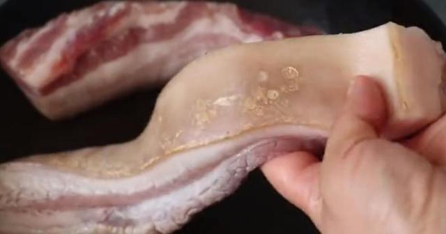 1、买回来的肥瘦相间的五花肉先清洗干净沥干水分, 然后起锅烧热,将五花肉猪皮朝下煎一下将猪皮收紧好切一下,煎至猪皮表面微黄后取出用刀子刮一下,刮掉猪皮上的脏东西去掉没有清除干净的猪毛,可以有效去除腥味;