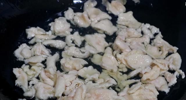 2、腌制好的鸡肉片先下入热油中,注意一定要开小火滑一下,鸡肉片变色滑熟后直接盛出备用,时间不要太长,太长时间会导致鸡肉片发柴,影响口感。