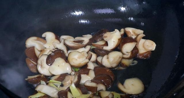 4、锅中留少量底油,油热下入切好的葱姜蒜片,开中小火不断翻炒出香味,然后下入切好的香菇片,翻炒几下后加入适量盐增加香菇的底味,继续翻炒至香菇变软,紧接着加入一些清水,继续翻炒将香菇炒熟透;