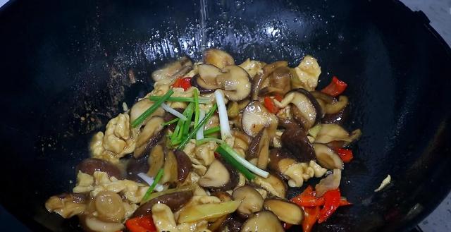 6、倒入适量水淀粉勾芡,开大火不断翻炒,待汤汁变得浓稠后加入切好的葱段,翻炒均匀后就可以关火出锅了,勾芡可以使汤汁更好的吸附在肉片上,味道更好,色泽更艳丽,然后盛入盘中,这道简单的家常菜香菇炒鸡片就做好了,鸡肉片鲜嫩爽滑,再加上香菇独特的香味,光是闻着就有着满满的食欲。