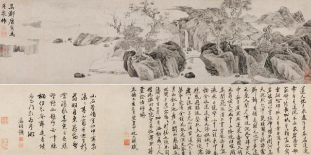 本幅唐寅作《月泉图卷》,水墨纸本绘就,画心长113厘米,题跋长135厘米,宽31厘米,卷首下部钤朱文“唐子畏图书”方印、朱文“六如居士”方印,图前段绘诸山旷远,晓雾迷蒙,竹篱参差掩隐茅堂数间,苍松郁茂,山泉奔泻而下,木桥横卧其间。墨色明洁,营造出幽深静谧的气氛。图后段绘山石杂木高耸,下有一高士,头戴方巾,身着宽袍,双手抚岸而坐,神态深沉,遥望万顷湖光。