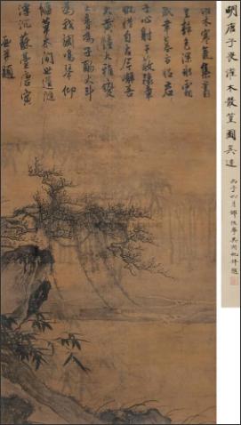 此轴《金昌暮烟图》图绘疏树溪山,云烟横销,林间草舍,水次扁舟,一派江天暮景。画面上方的高岭山石也多是湿笔长皴,但用墨较为清淡而湿润,枝叶浓密,别有情致。整幅作品,高柳婆娑,意向清俊秀逸,墨色淋漓,又富浓淡变化。远景与近景相连,意境高远。他的山水画有粗细两种风格,粗笔一路源自周臣,然于刚健中别具清俊秀逸之韵;细笔画属其本色,更多文人画笔意,景色简约清朗,用笔纤细有力,墨色淋漓多变,风格奇峭而又丰润。