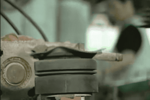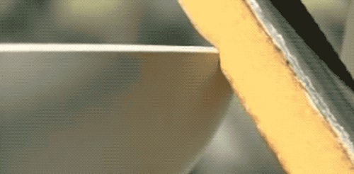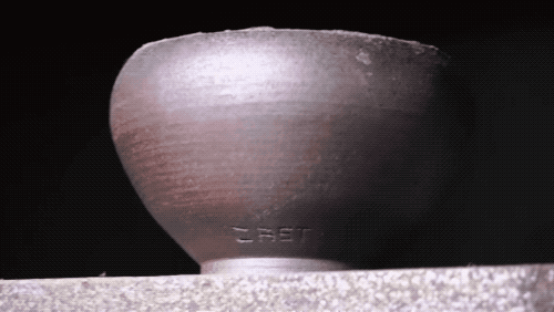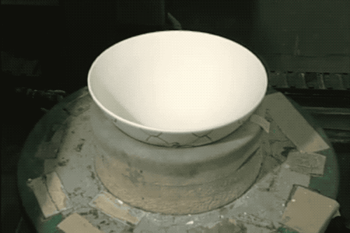 来看一个特写图,底下的泥碗自己在转,湿润的海绵一直朝上抹过,饭碗走这么几圈就把边沿抹圆润了。