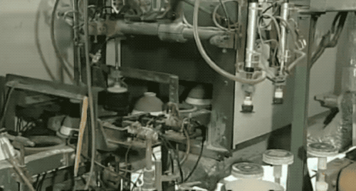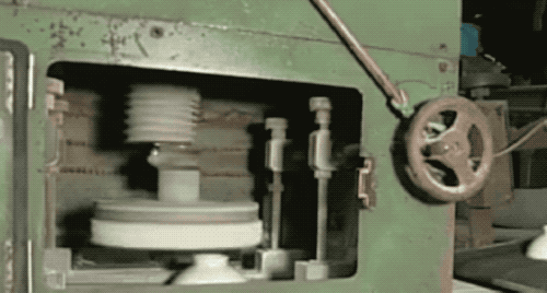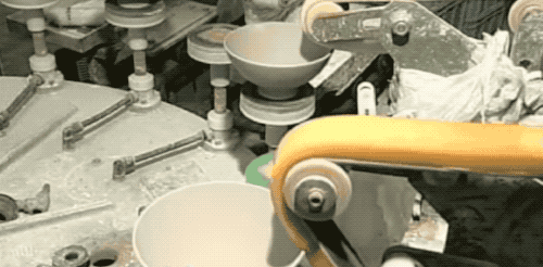 到了我们的机器一条龙环节,一切都看起来井然秩序!首先把切下来的泥料送进旋车机,上面模具按斜边碗型下压,底下的切片刮刀去除多余泥料,一个碗的雏形就出现了......