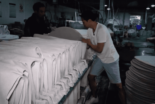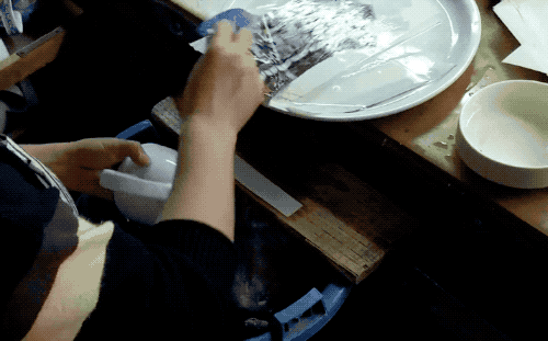吃饭的家伙,天天和唇齿打交道,就还需要把饭碗边沿做得圆滑,流水线里的操作就用到了湿润的带状海绵。
